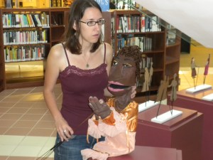 All the items in the title were objects that Genna and I used while setting up the puppets at our new EXHIBIT at Arlington Central Library this Saturday. You can see our puppets there anytime the library is open from now through September 31st. Here are some pictures of us setting up the displays and doing impromptu demonstrations for the kids hanging around. We hope you can stop by and see our work!