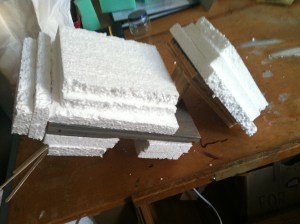 Here is the skeleton of the puppet, made out of wood scraps and filled out a little more with styrofoam.
