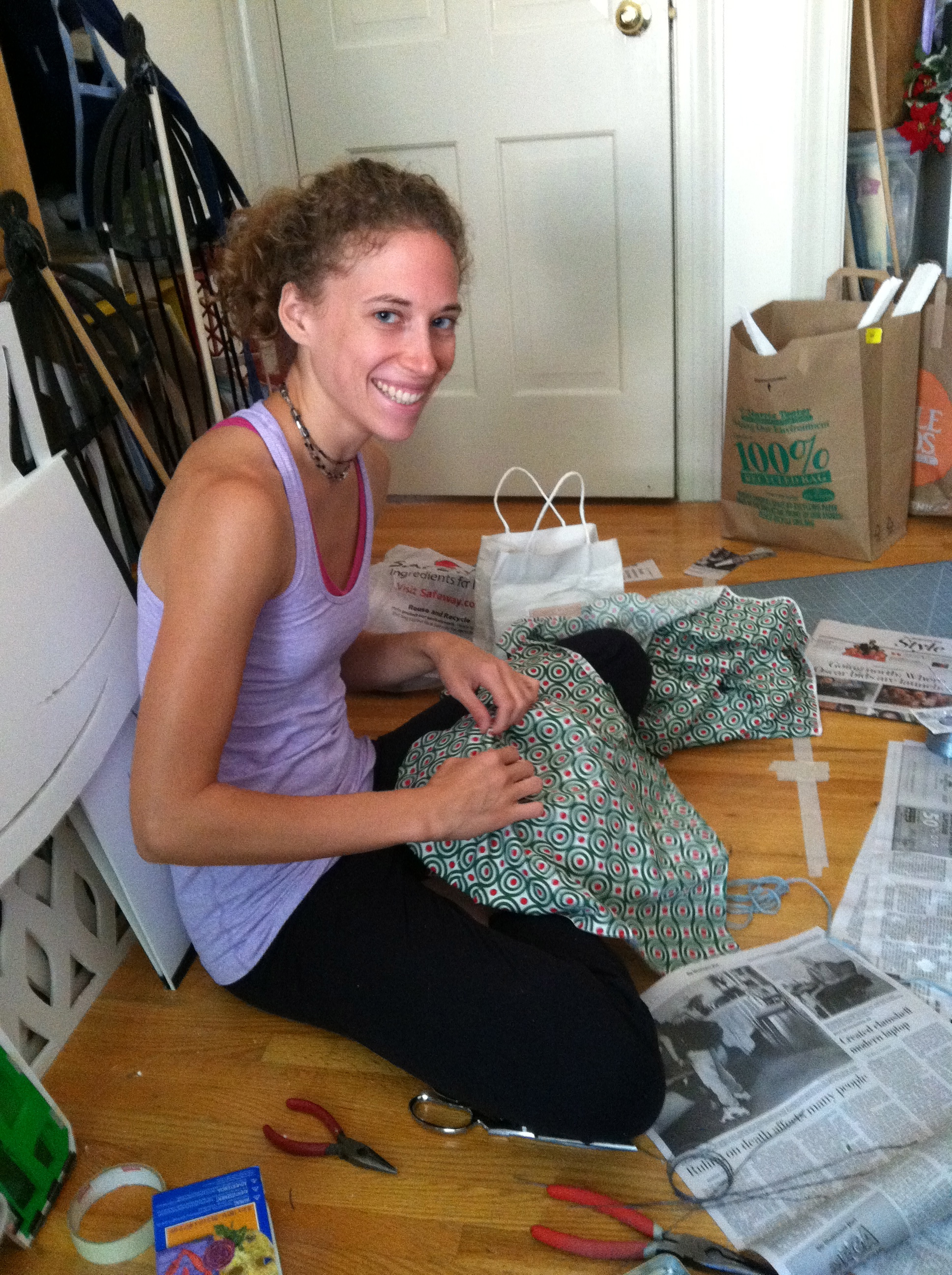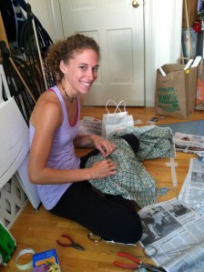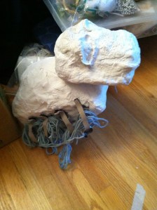I couldn’t take a final picture of him because Genna took him home to add feet onto the ends of the legs! I will have more pictures soon. Meanwhile, here are some shots of the materials we are using to make the animals for the rest of the show, and Genna working on a new Turtle puppet.