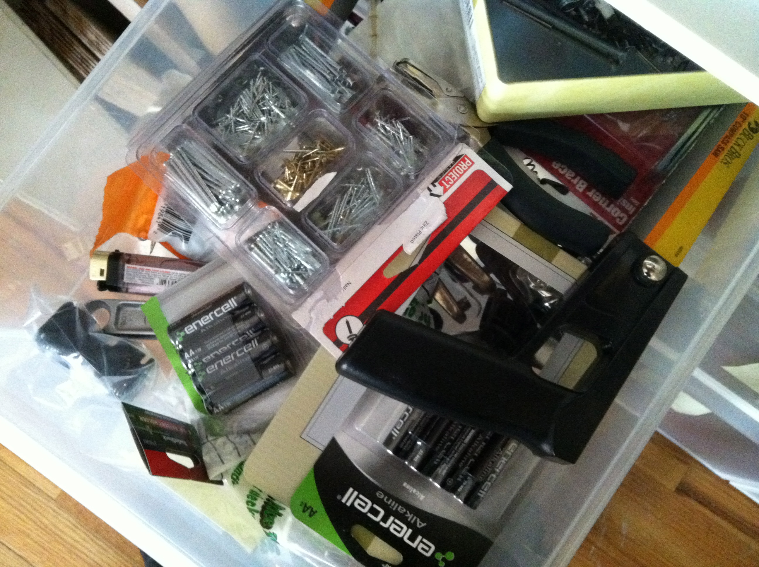 This is, I think, the most ongoing of my necessary evil chores. Cleaning out the hardware drawer, which most of the time, looks like this: