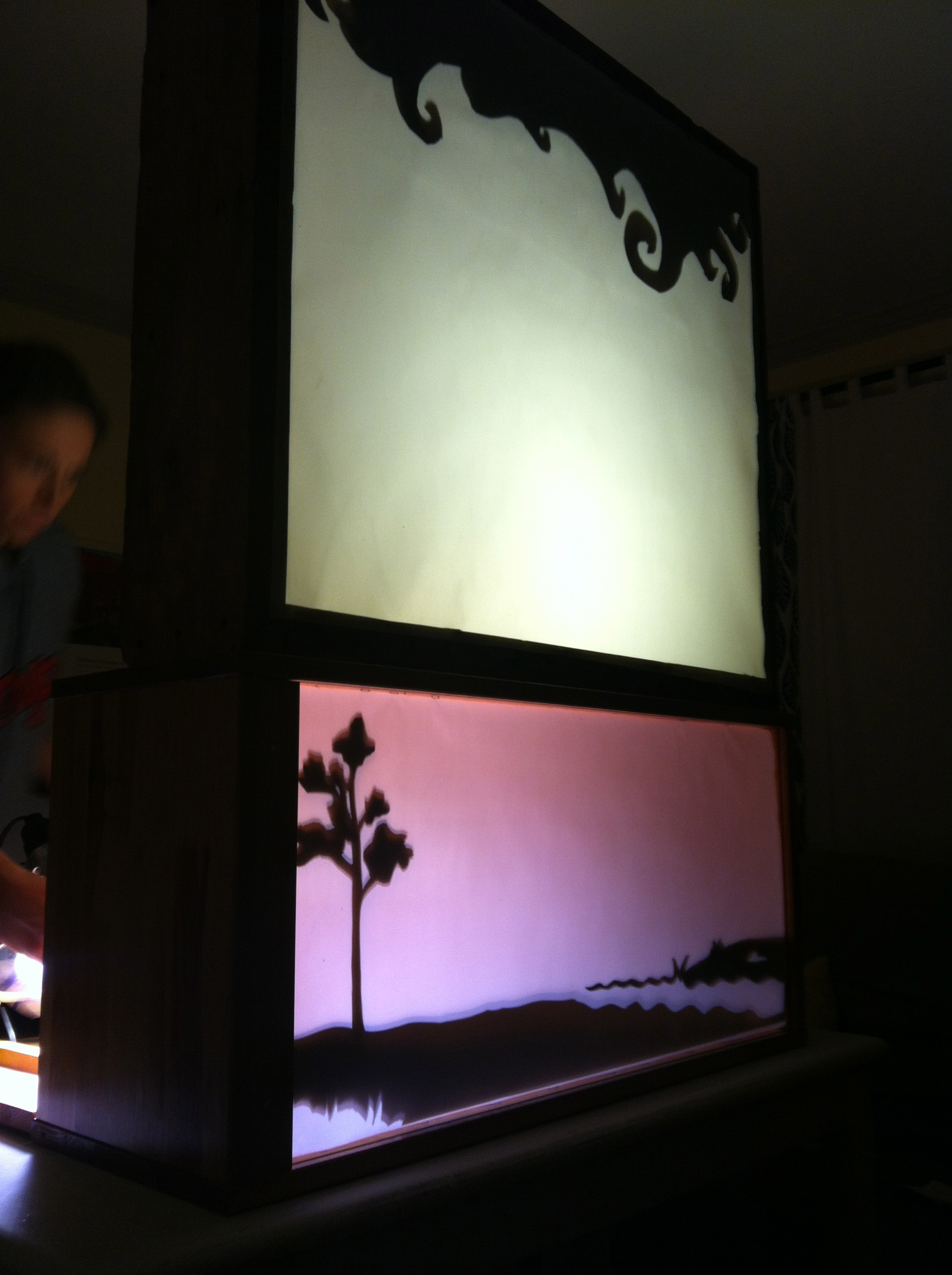 How long does it take us to build a new puppet show? Coyote Places the Stars, which is a 5 minute show, took us about two weeks from start to finish. That includes writing and recording the script, designing and creating the puppets, creating the lightboxes and rehearsing all the movement. We divided a lot of the work; Cecilia handled the script, based on an idea from Genna and cut out puppets, while Genna designed all the puppets and sets and built the lightboxes. Here are some photos from the process: