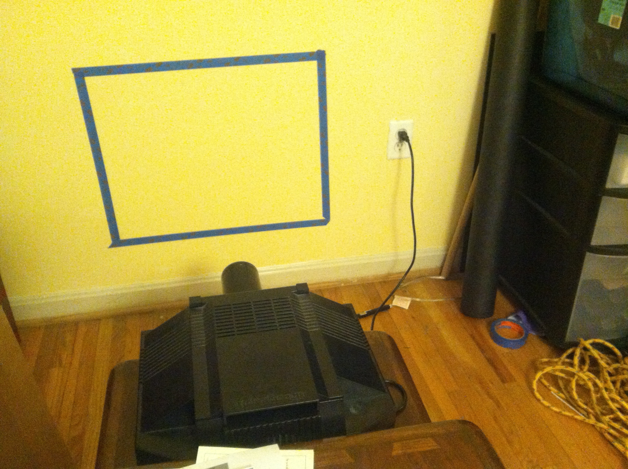 1. Set up this opaque projector so I can play with the size of the image. The taped out square is the size of the screen.